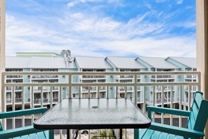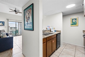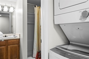 Main Level: The first floor of this two-story unit features a bright, open living area with a sleeper sofa, flat-screen TV, and a private balcony. Enjoy partial Gulf views and the soothing sound of the waves right from your chair. This level also includes a full bathroom, a compact fully equipped kitchen, and an in-unit washer/dryer.