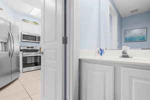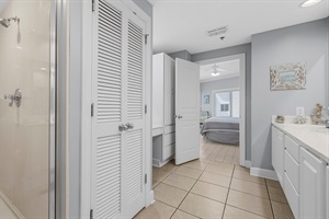 1 Bedroom • 2 Bathrooms (1 full, 1 half) 2 Baths (1 full, 1 half) • Sleeps 1-4This beautifully designed, spacious condo on the fifth floor of Palm Beach Resort offers a luxurious and comfortable living experience. The main bedroom is generously sized, featuring a king-size bed and an adjoining, high-end main bathroom. This bathroom is equipped with a double vanity, a relaxing soaking tub, a walk-in shower, and a convenient washer/dryer.