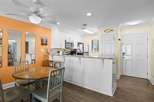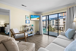 The living room features lovely furnishings and a flat-screen TV. There’s a balcony off the living room with comfortable seating and partial views of the pool and beach. The dining table seats four comfortably, with additional bar stools at the kitchen counter.