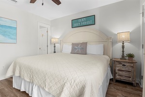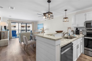 The inviting living area is designed for both style and relaxation, featuring tasteful furnishings, a flat-screen TV, and a queen sofa sleeper to accommodate extra guests. Natural light spills in from the private balcony, where you can settle into comfortable seating and take in partial views of the sparkling pool and the emerald Gulf waters. Adjacent to the living space, the dining area seats six comfortably at the table, with additional bar stool seating at the kitchen breakfast bar for casual morning coffee. When it’s time to retreat, the master suite offers a plush king-size bed and a private en-suite bathroom. The guest bedroom is equally welcoming, featuring a comfortable queen-size bed and easy access to the second full bathroom, making this layout perfect for families or couples traveling together.