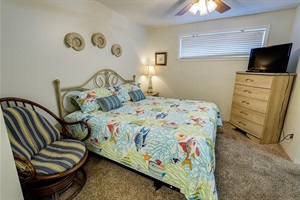 Upstairs, the primary bedroom offers a comfortable king bed and its own full bathroom, providing a quiet retreat after a day at the beach.
