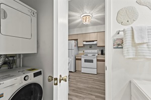 Step outside to enjoy the elevated pool and sundeck, where you can soak up the sun while taking in panoramic views of the lagoon. Thoughtful touches like a stackable washer and dryer add convenience to your stay.