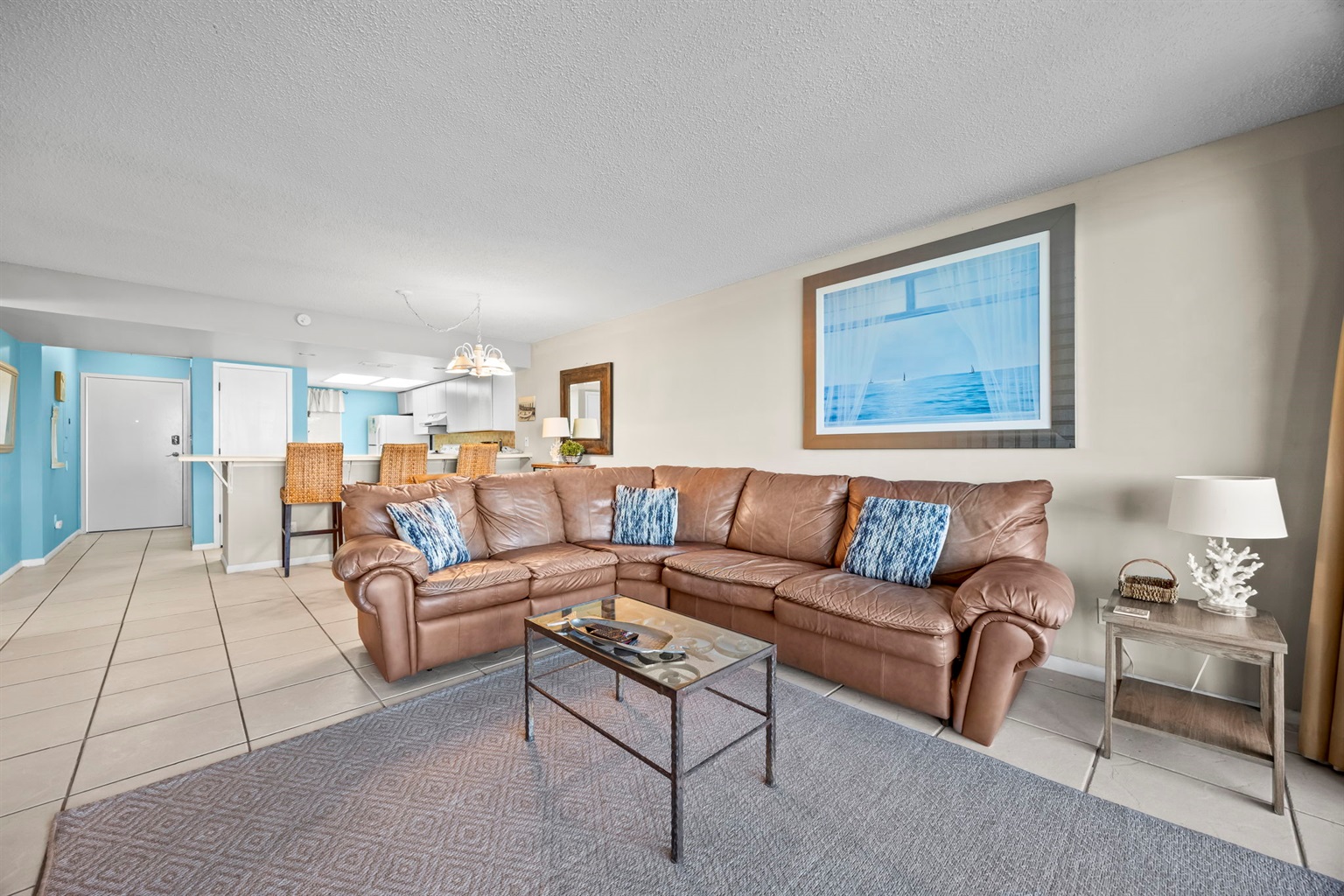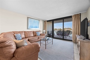 Living Area: An open-concept space featuring a Queen sleeper sofa, perfect for movie nights after a day in the sun.